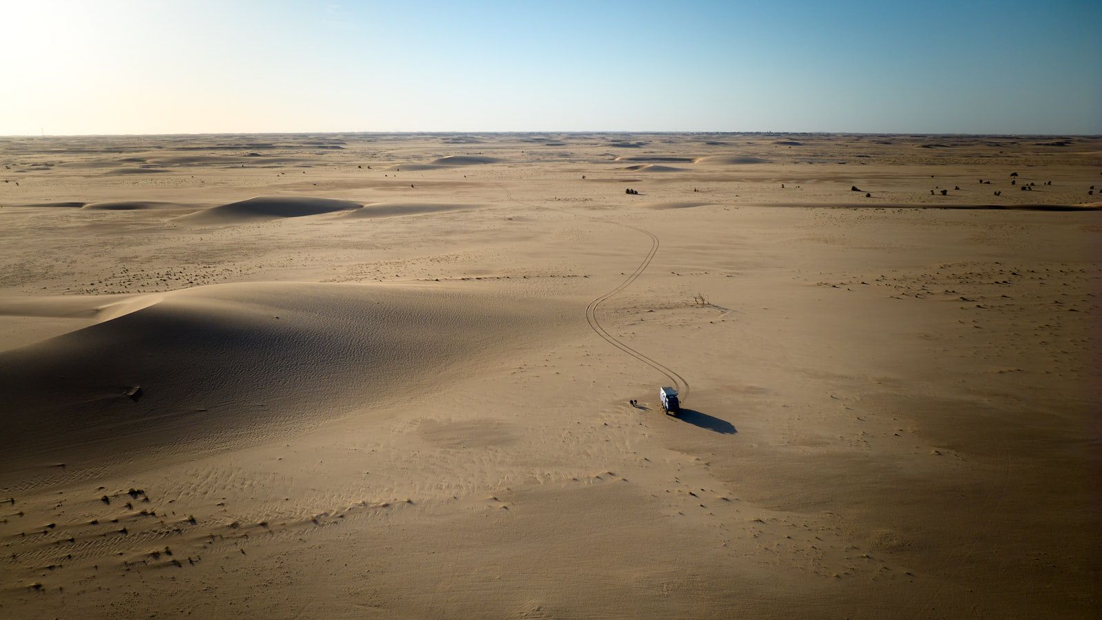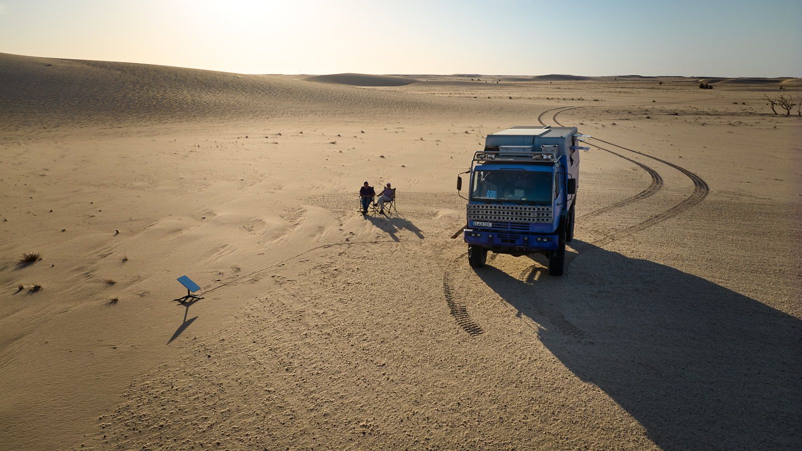 Wir reduzieren den Reifenfülldruck auf 3,0 bar und verlassen das Asphaltband. Nur wenige Pistenkilometer später biegen wir zu kleinen Sicheldünen im Osten ab. Hier verbringen wir die Nacht.