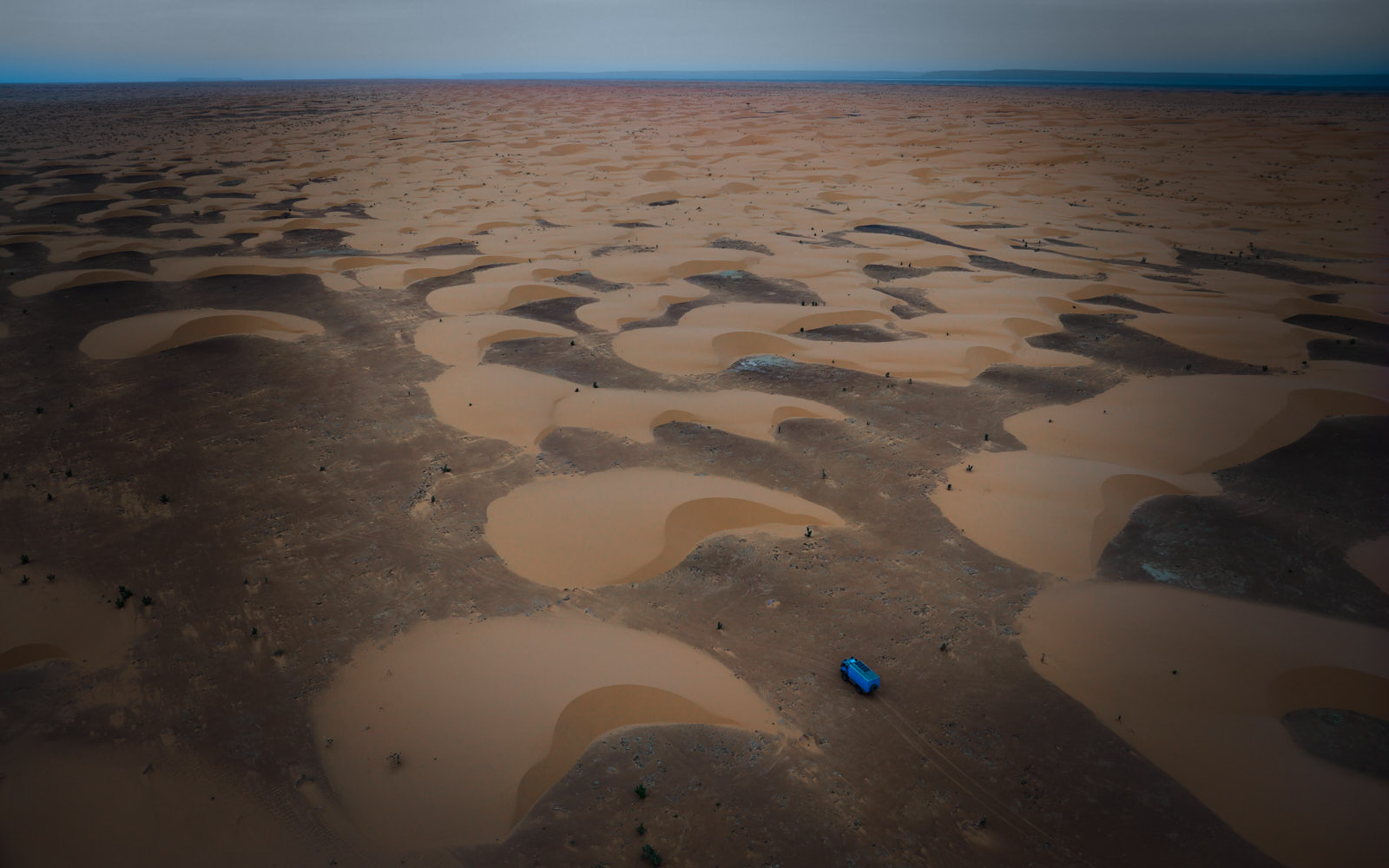 An einem Sicheldünenfeld gelingen uns schöne Filmaufnahmen mit der Drohne. Der Himmel war den ganzen Tag bewölkt, wodurch die Landschaft etwas farblos wirkte. Hier haben wir eine Mittagspause gemacht.