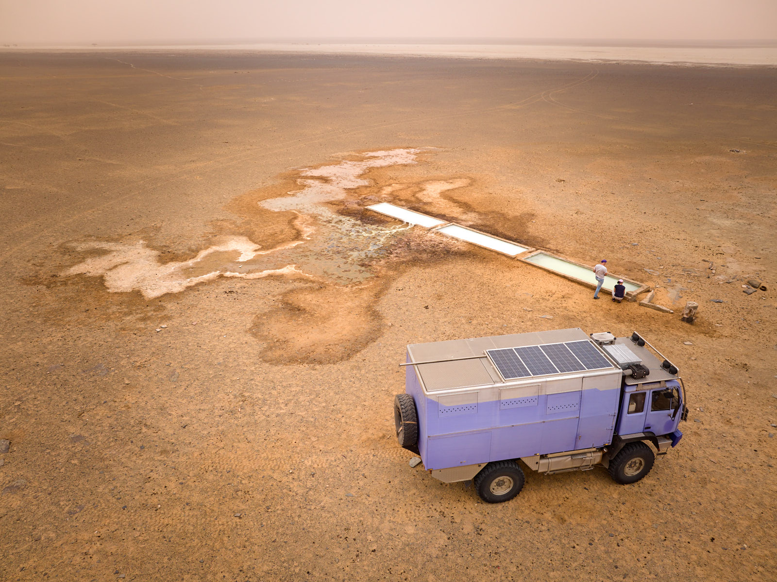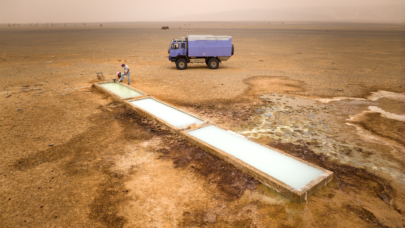 Heute wollen wir unser erstes Etappenziel der Expedition, die beiden dreieckigen Forts aus der französischen Kolonialzeit erreichen. Schon am Morgen setzt heftiger Wind ein, der die Landschaft in ein milchig graues Licht hüllt. Die Piste ist immer gut erkennbar aber wenig befahren. Wegen der vielen Bodenwellen kommen wir überwiegend nur langsam voran. Der Tacho steigt kaum über 25 km/h hinaus. Auf der Hälfte der Strecke bis zu den Forts biegen wir von der Piste zu einem artesischen Brunnen ab. Das lauwarme, schwefelhaltige Wasser fließt in drei rechteckige Becken. Aus der Luft sieht die Szenerie ganz imposant aus.