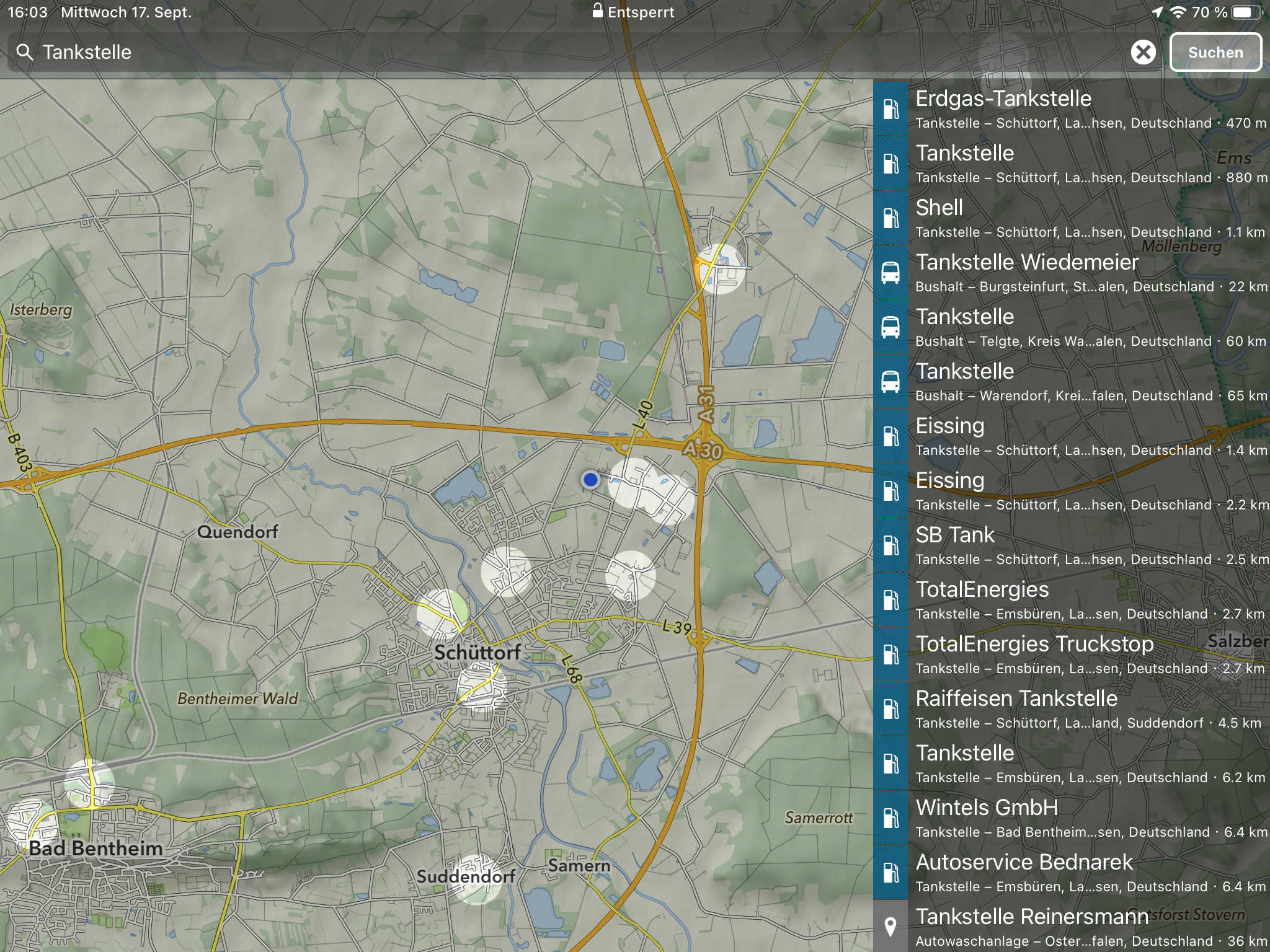 Du kannst auch nach Tankstelle, Restaurant, Parkplatz oder Supermarkt in einer Region tippen und bekommst die Supermärkte in einer näheren Umgebung angezeigt.