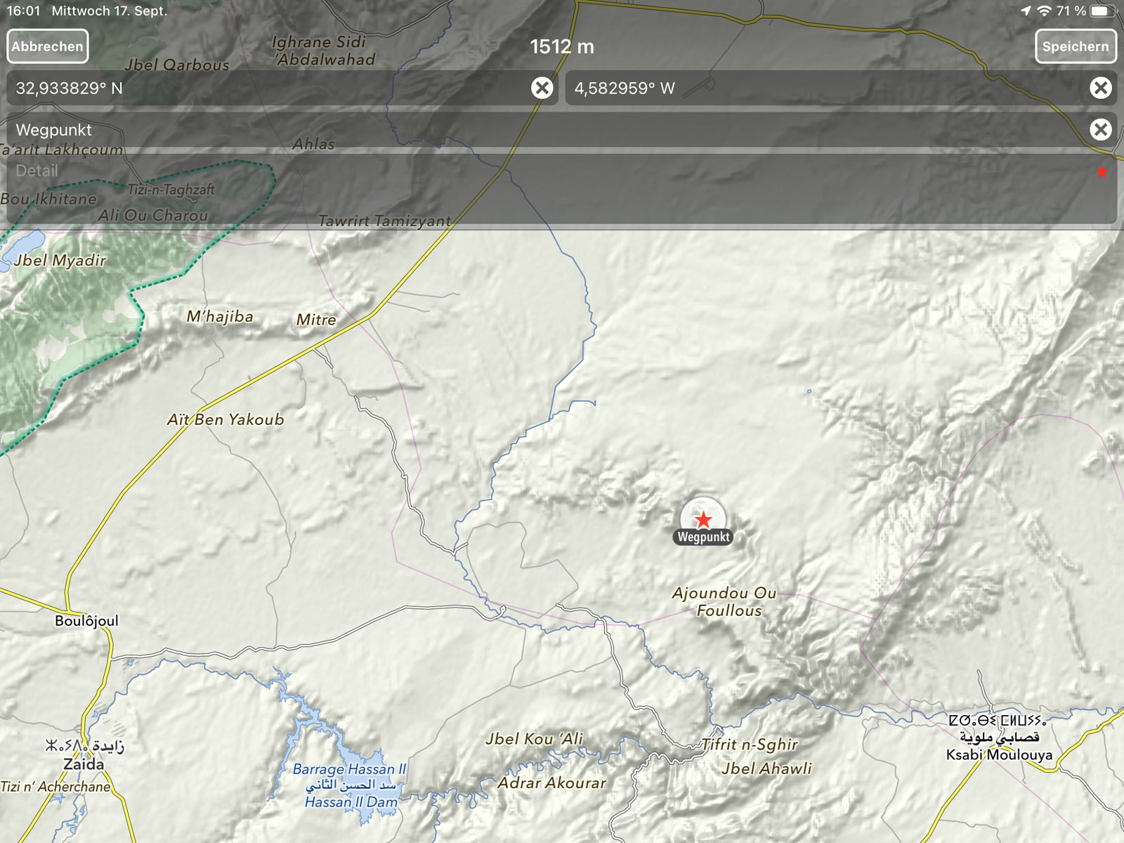Du kannst jetzt den Wegpunkt auf der Karte verschieben und genau positionieren. Die Koordinaten werden in den Feldern und Breiten- und Längengrad angezeigt.