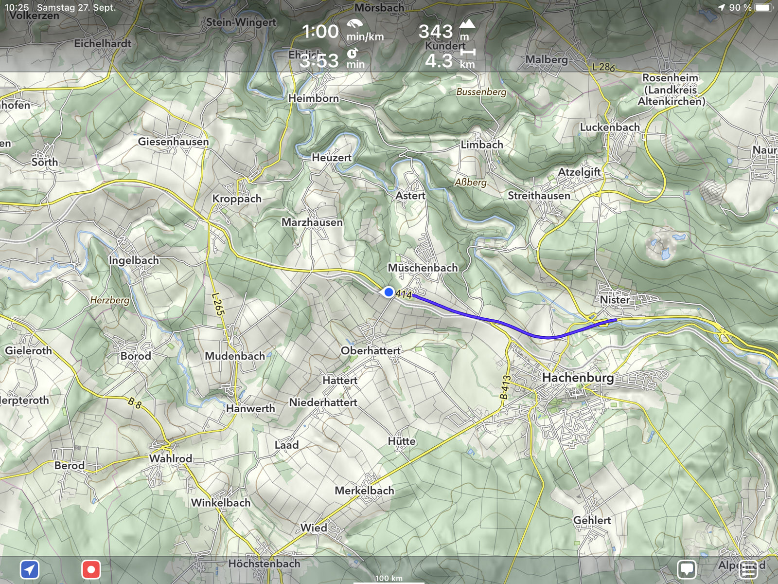 Gleichzeitig entsteht auf der Karte eine blaue Linie, dein aufgezeichneter Track.