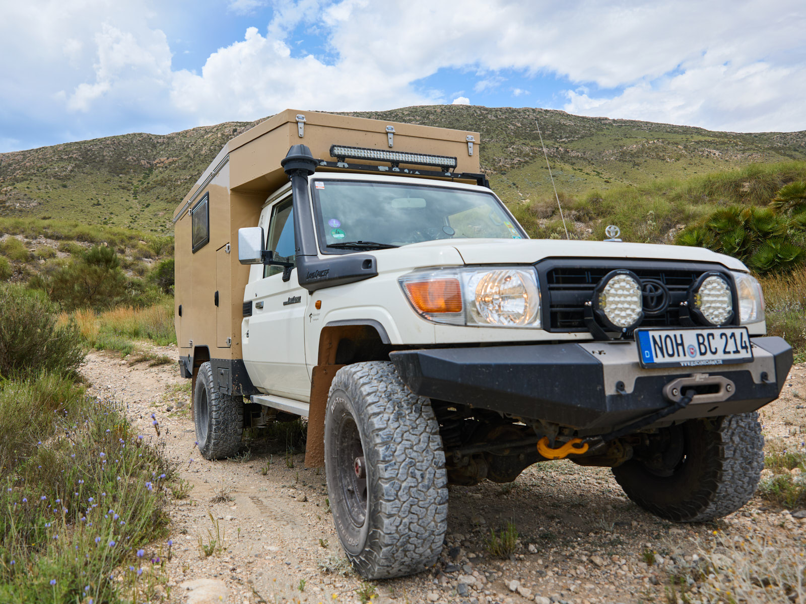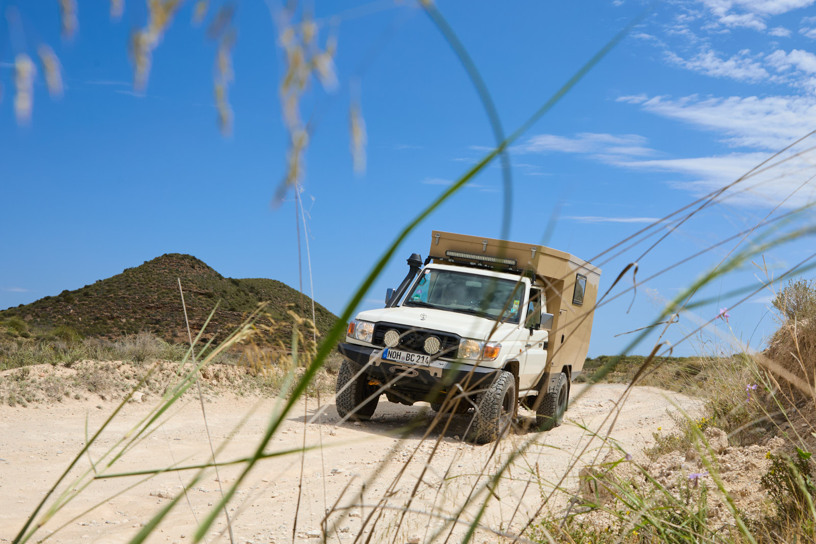 Mein alter HZJ78 hatte Scheinwerfer, die „einen Schein werfen“. Die Kerzenlichter waren am Tag kaum zu erkennen, erst in der Nacht konnte man einen Lichtschein vermuten. Bei modernen Fahrzeugen sieht das schon ganz anders aus. Ob nun Xenon oder LEDs, das Licht nutzen wir und bauen es in die Bildgestaltung mit ein. Standlicht wird wahrscheinlich gar nicht auffallen, das Abblendlicht eignet sich deutlich besser. Viele Offroader sind mit Zusatzscheinwerfer ausgerüstet. Bei dunklen Szenen kann es zu Blendungen/Überbelichtungen führen, bei Sonnenlicht sind erst dadurch die Scheinwerfer zu erkennen. Die Ausleuchtung durch Fernscheinwerfer oder der LED-Bar auf dem Dach kannst du vor der Reise gut testen und musst dann nicht aufgrund des Lichtes erst den richtigen Fotografen-Standpunkt auf der Reise suchen. Also, auch wenn das Fahrzeug steht, Licht an!
