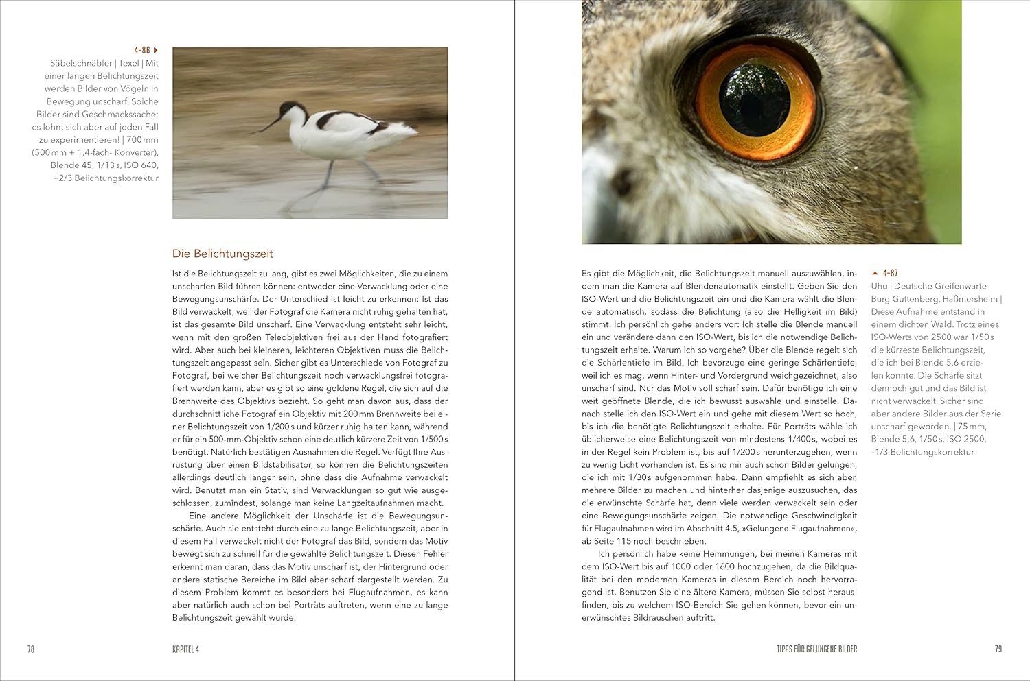 Im Hauptteil werden dann zahlreiche Gestaltungstechniken und Aufnahmetipps für das Fotografieren von Vögeln anhand von Bildbeispielen vermittelt. So schulen Sie Ihr Auge und damit das Bewusstsein, was ein gelungenes Vogel-Foto ausmacht.