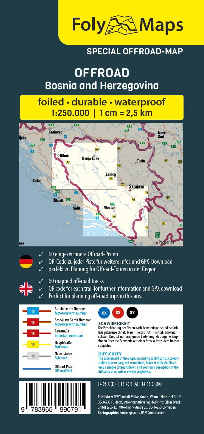 Entdecke die Offroad-Faszination in Bosnien-Herzegowina mit der FolyMap Spezialkarte Offroad Bosnien-Herzegowina – dein unentbehrlicher Wegweiser für abenteuerliches Offroad-Fahren. Speziell für diese Region gestaltet, bietet die Karte 60 ausgewählte Offroad-Strecken, jede markiert und begleitet von nützlichen Basisinfos und einem QR-Code. Ein Scan des QR-Codes enthüllt detaillierte Routenbeschreibungen und den GPX-Download zu der Piste. Diese folierte Karte ist robust, wetter- und reißfest sowie beschreibbar, ideal für deine Notizen und Pläne. Ihr handliches Format und die präzise Kartographie machen sie zum Must-have für Offroad-Enthusiasten, die die wilden und teilweise spektakulären Wege der Westalpen erkunden wollen. Die Features der FolyMap Offroad Bosnien-Herzegowina im Überblick : * 60 eingezeichnete Offroad Pisten incl. GPX Download * Basis Informationen wie Schwierigkeitsgrad und Länge zu jeder Piste * foliert * strapazierfähig * wetterfest * Maßstab 1:250.000 * Übersichtliche Kartographie Entdecke die Welt der FolyMaps Offroad Spezialkarten – dein unentbehrlicher Begleiter für außergewöhnliche Offroad-Abenteuer. Diese spezielle Serie konzentriert sich auf die besten Offroad Region Europas und jeweils über 50 sorgfältig ausgewählte Offroad-Pisten der jeweiligen Region. Jede Piste ist auf der Karte eingezeichnet und wird durch stichpunktartige Basisinformationen und einen praktischen QR-Code ergänzt. Scanne den QR-Code, um detaillierte Streckenbeschreibungen und den GPX-Download für jede Route zu erhalten. Die FolyMap Offroad Spezialkarten sind robust, wetterfest, reißfest und beschreibbar – ideal für das Notieren deiner Entdeckungen und Pläne. Mit einem handlichen Format und präzisen Kartographie sind diese Karten perfekt für jeden Offroad-Enthusiasten, der Wert auf Qualität, Zuverlässigkeit und das Entdecken abenteuerlicher Pfade legt.