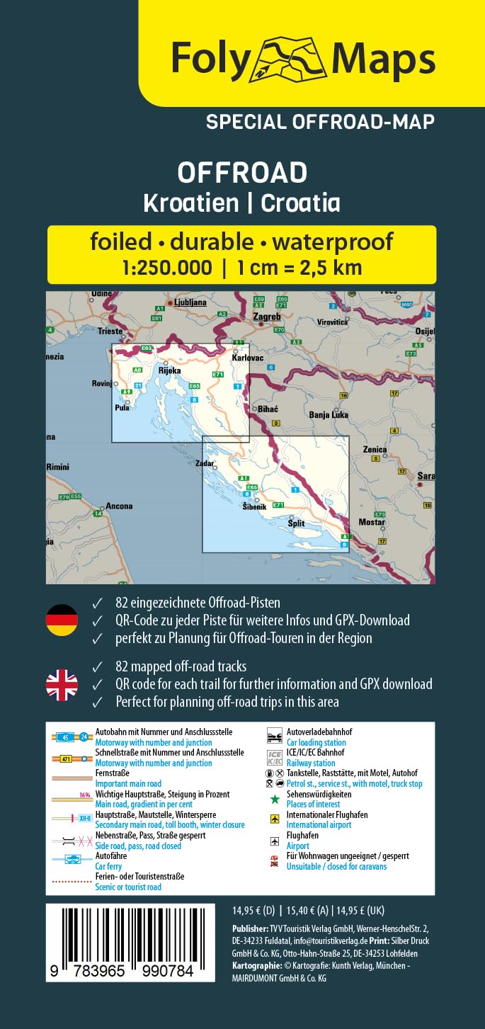 Entdecke die Offroad-Faszination Kroatien mit der FolyMap Spezialkarte Offroad Kroatien – dein unentbehrlicher Wegweiser für abenteuerliches Offroad-Fahren. Speziell für diese Region gestaltet, bietet die Karte 82 ausgewählte Offroad-Strecken, jede markiert und begleitet von nützlichen Basisinfos und einem QR-Code. Ein Scan des QR-Codes enthüllt detaillierte Routenbeschreibungen und den GPX-Download zu der Piste. Diese folierte Karte ist robust, wetter- und reißfest sowie beschreibbar, ideal für deine Notizen und Pläne. Ihr handliches Format und die präzise Kartographie machen sie zum Must-have für Offroad-Enthusiasten, die die wilden und teilweise spektakulären Wege der Westalpen erkunden wollen. Die Features der FolyMap Offroad Kroatien im Überblick : * 82 eingezeichnete Offroad Pisten incl. GPX Download * Basis Informationen wie Schwierigkeitsgrad und Länge zu jeder Piste * foliert * strapazierfähig * wetterfest * Maßstab 1:250.000 * Übersichtliche Kartographie Entdecke die Welt der FolyMaps Offroad Spezialkarten – dein unentbehrlicher Begleiter für außergewöhnliche Offroad-Abenteuer. Diese spezielle Serie konzentriert sich auf die besten Offroad Region Europas und jeweils über 50 sorgfältig ausgewählte Offroad-Pisten der jeweiligen Region. Jede Piste ist auf der Karte eingezeichnet und wird durch stichpunktartige Basisinformationen und einen praktischen QR-Code ergänzt. Scanne den QR-Code, um detaillierte Streckenbeschreibungen und den GPX-Download für jede Route zu erhalten. Die FolyMap Offroad Spezialkarten sind robust, wetterfest, reißfest und beschreibbar – ideal für das Notieren deiner Entdeckungen und Pläne. Mit einem handlichen Format und präzisen Kartographie sind diese Karten perfekt für jeden Offroad-Enthusiasten, der Wert auf Qualität, Zuverlässigkeit und das Entdecken abenteuerlicher Pfade legt.