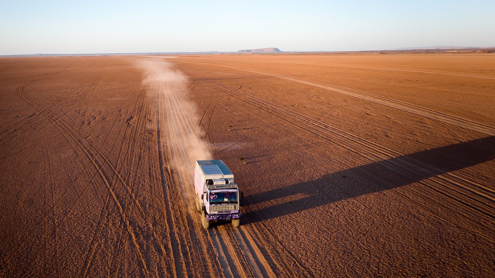 16.01.2026 Die ersten Sonnenstrahlen des Tages. Lange Schatten. Lange Staubwolke im Rückspiegel. Der Tag beginnt gut.