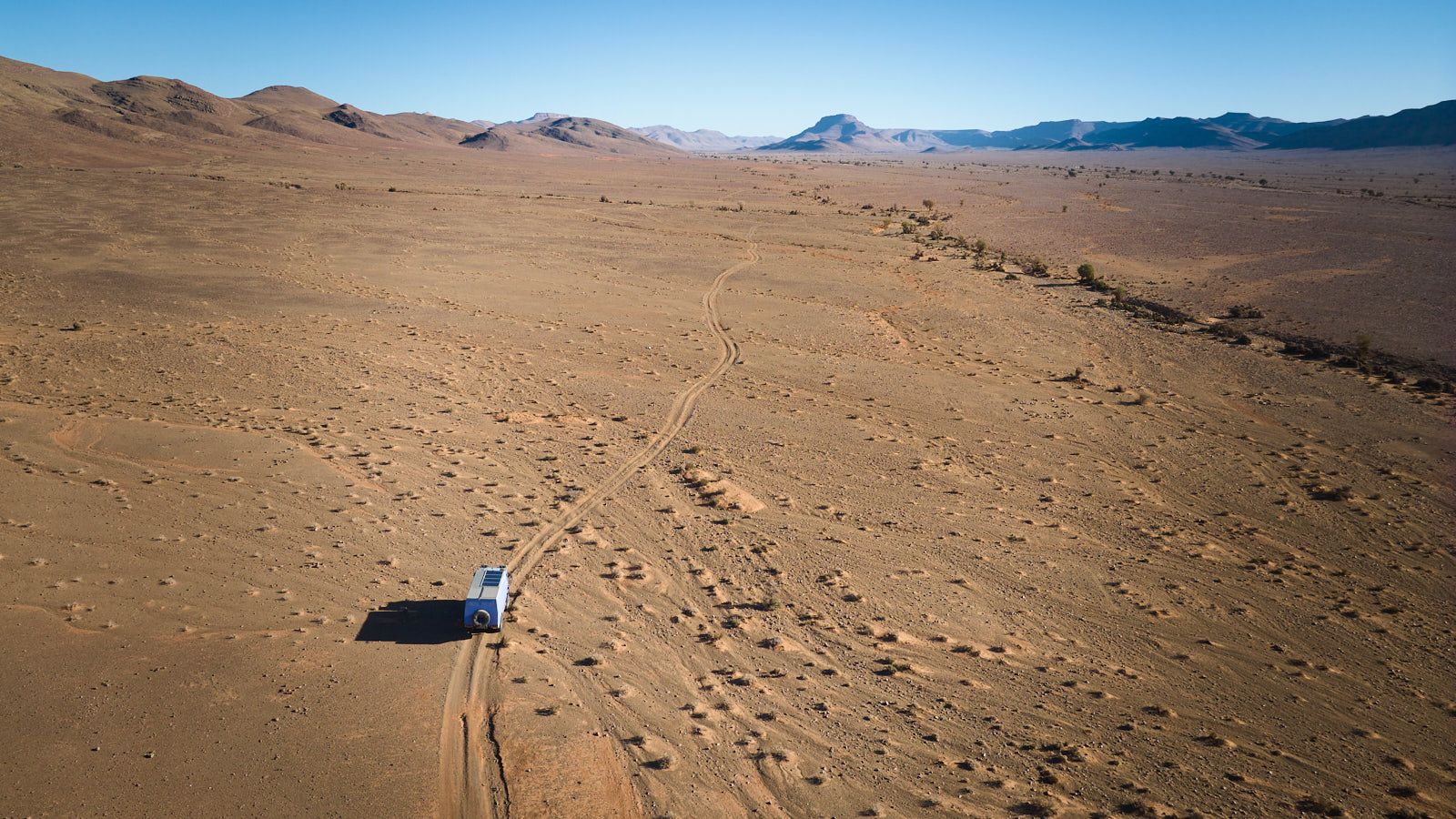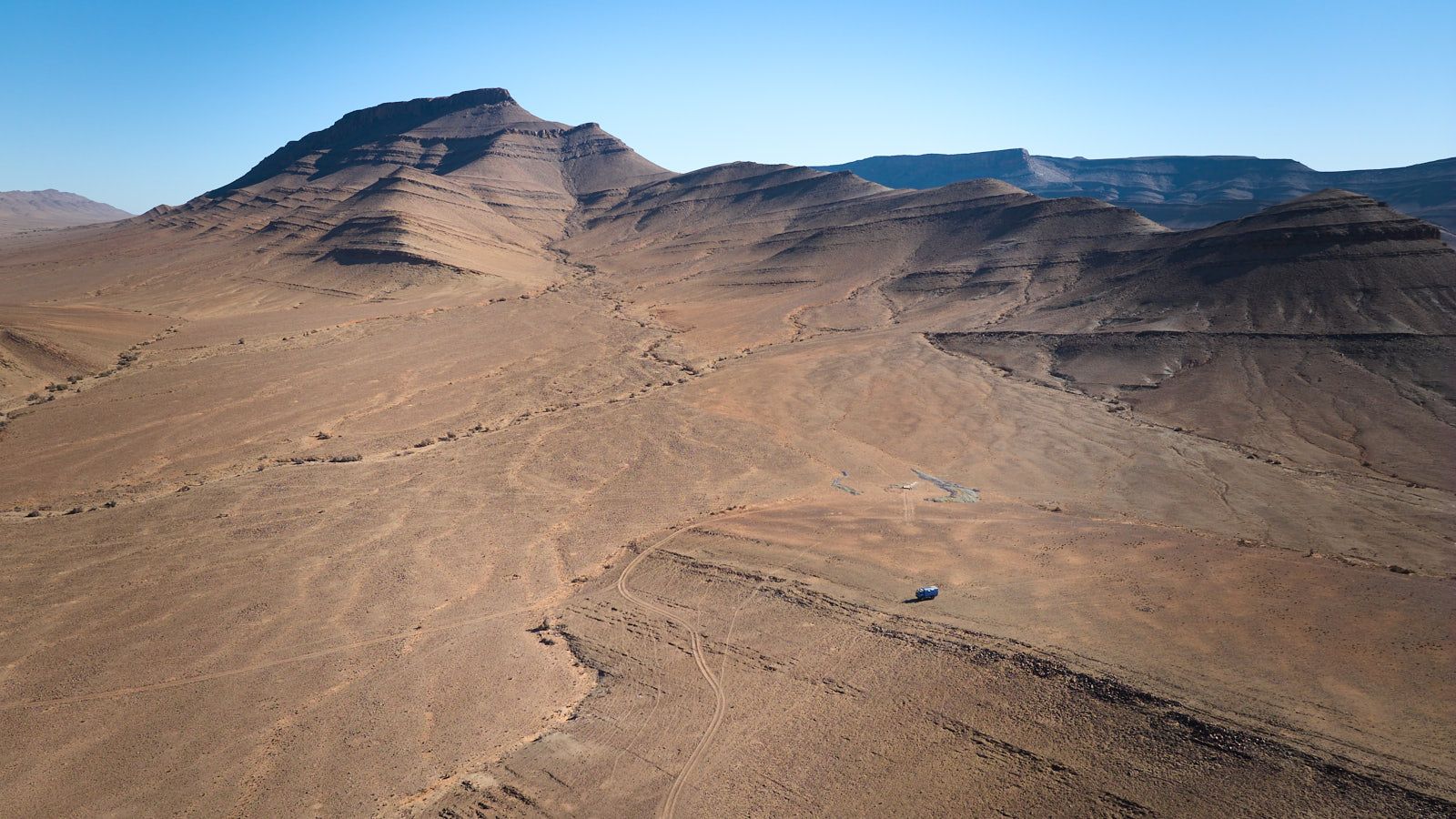 29.01.2024 Vor der Bergkette am fernen Horizont verläuft die Asphaltstraße. Eigentlich wollten wir diese heute erreichen, aber wie das unterwegs so ist: Zwischendrin eine Einladung zum Tee, dort ein Fotostopp, hier ein Flug mit dem Elektrovogel und schon steht die Sonne im Westen. Also bleiben wir heute hier, suchen uns irgendwo einen freien Platz zum Campen für die Nacht. Morgen geht es dann auf Asphalt 60 km nach Bouarfa.