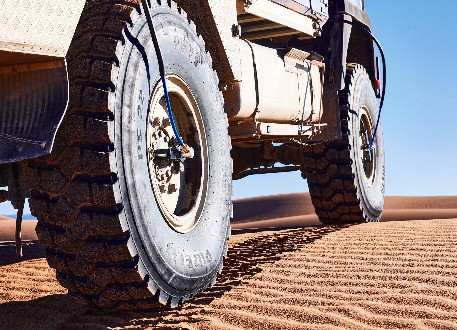 Das Bild zeigt eine Situation, die typisch nach Regenfällen in der Wüste und extrem gefährlich und tückisch ist. Der aufgeweichte Sand ist bodenlos, das Steckenbleiben fast garantiert und ein Befreien kaum möglich.
