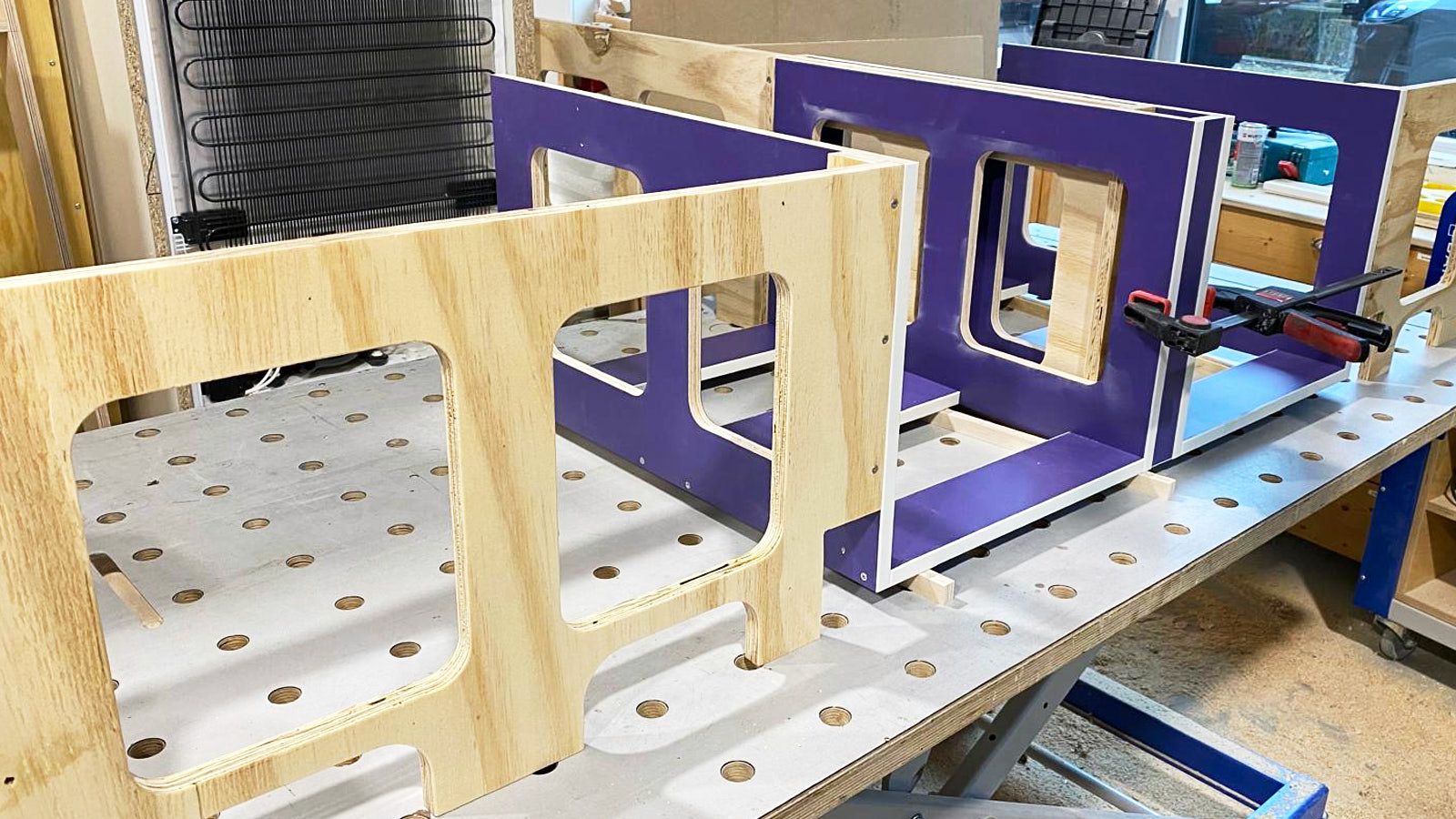 11.02.2026 Es geht los. Das Team von Schreinerei Reuter – Lennestadt sendet die ersten Bilder aus der Produktion. Als Holz werden Queenply-Platten von plattenladen.eu verwendet, die etwa 40% leichter sind als Pappel-Sperrholz. Trotz dieser extremen Leichtigkeit werden die Möbelgestelle nur als Korpus ausgeführt. Die Platten sind teilweise mit einem violetten HPL angeliefert worden und diese werden später im exakten „Pistenkuh-lila“ lackiert. (HPL-Oberflächen (High Pressure Laminate) sind extrem robuste, langlebige und hygienische Hochdrucklaminate, die aus harzgetränkten Papierbahnen unter hoher Hitze und Druck gepresst werden. Sie zeichnen sich durch Kratz-, Stoß- und Wasserfestigkeit aus und sind ideal für stark beanspruchte Bereiche wie Küchenarbeitsplatten.)